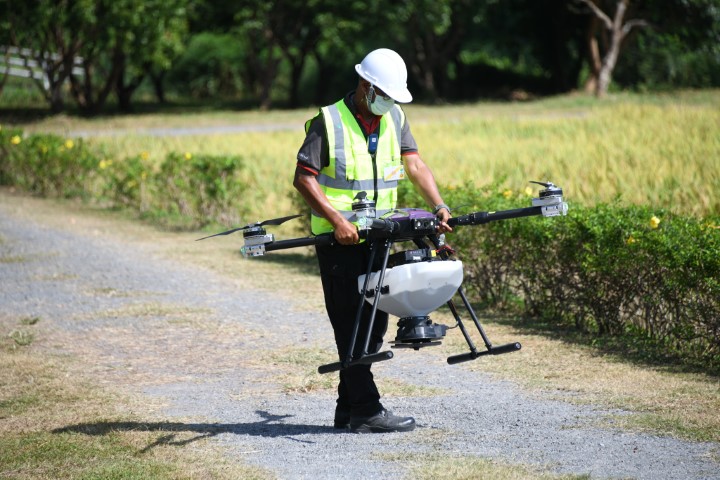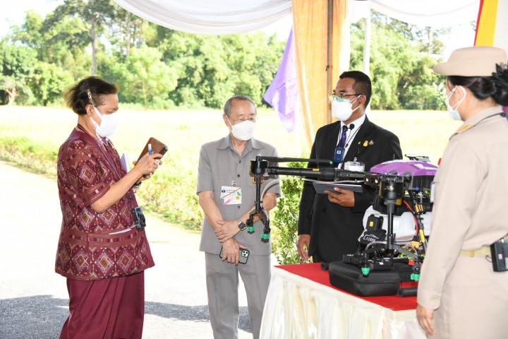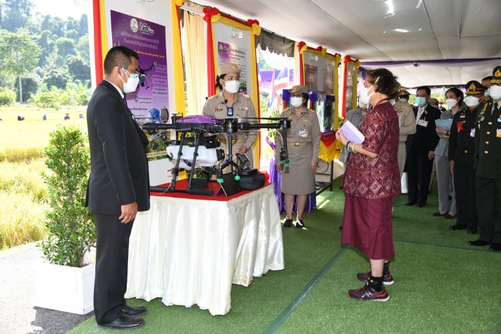 โอกาสนี้ได้ทอดพระเนตรการสาธิตการใช้อากาศยานไร้คนขับ (โดรน) ในการหว่านพืชบำรุงดินหลังนา ซึ่งเป็นการนำเทคโนโลยีมาใช้ในการเกษตรเพื่อประหยัดเวลาและเพิ่มประสิทธิภาพในการเพาะปลูก