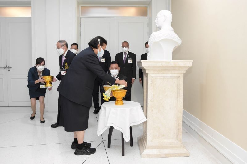 ในการนี้ได้ทอดพระเนตรการพัฒนาผลิตภัณฑ์จากเสื่อกก โดยความร่วมมือของมูลนิธิชัยพัฒนา สถาบันเทคโนโลยีพระจอมเกล้าเจ้าคุณทหารลาดกระบัง บริษัท แทงโก้ เลเธอร์ จำกัด บริษัท แพรคติก้า จำกัด และสตูดิโอ โอดีเอ ที่ร่วมกันออกแบบและพัฒนาเสื่อกกแก่กลุ่มเกษตรกรในจังหวัดสุรินทร์ จนสามารถพัฒนาลวดลายที่ทันสมัยแต่ยังคงเอกลักษณ์ท้องถิ่น สามารถนำไปจำหน่ายเพื่อเพิ่มรายได้อย่างยั่งยืน จากนั้น นายฐาปน สิริวัฒนภักดี กรรมการผู้อำนวยการใหญ่ บริษัท ไทยเบฟเวอเรจ จำกัด (มหาชน) น้อมเกล้าถวายฯ พระบรมรูปหล่อหินอ่อน พระบาทสมเด็จพระบรมชนกาธิเบศร มหาภูมิพลอดุลยเดชมหาราช บรมนาถบพิตร