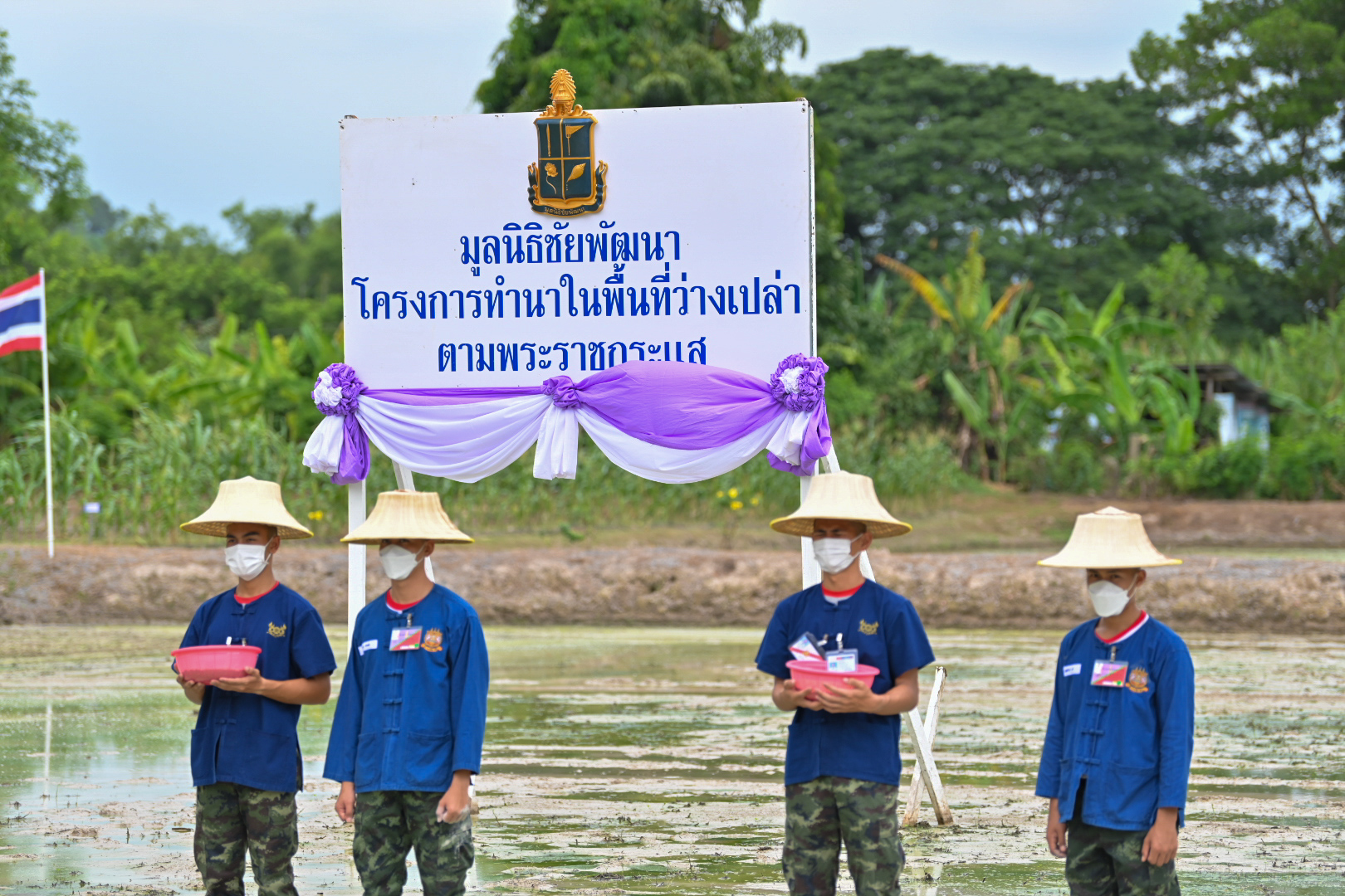 สำหรับข้าวที่ทรงปลูกในครั้งนี้คือข้าวพันธุ์ กข 87 โดยทรงปลูกด้วยวิธีหว่านน้ำตม ซึ่งเป็นวิธีการปลูกที่นิยมในเขตนาชลประทาน เนื่องจากประหยัดจำนวนเมล็ดพันธุ์ ซึ่งเป็นข้าวที่นำขึ้นจากน้ำมาหุ้มด้วยกระสอบหรือผ้าเพื่อให้กองเมล็ดข้าวมีความชื้นใช้เวลา 1-2 คืน และรากจะค่อยๆ งอก ช่วยให้การเจริญเติบโตรวดเร็วขึ้นหลังจากการหว่าน