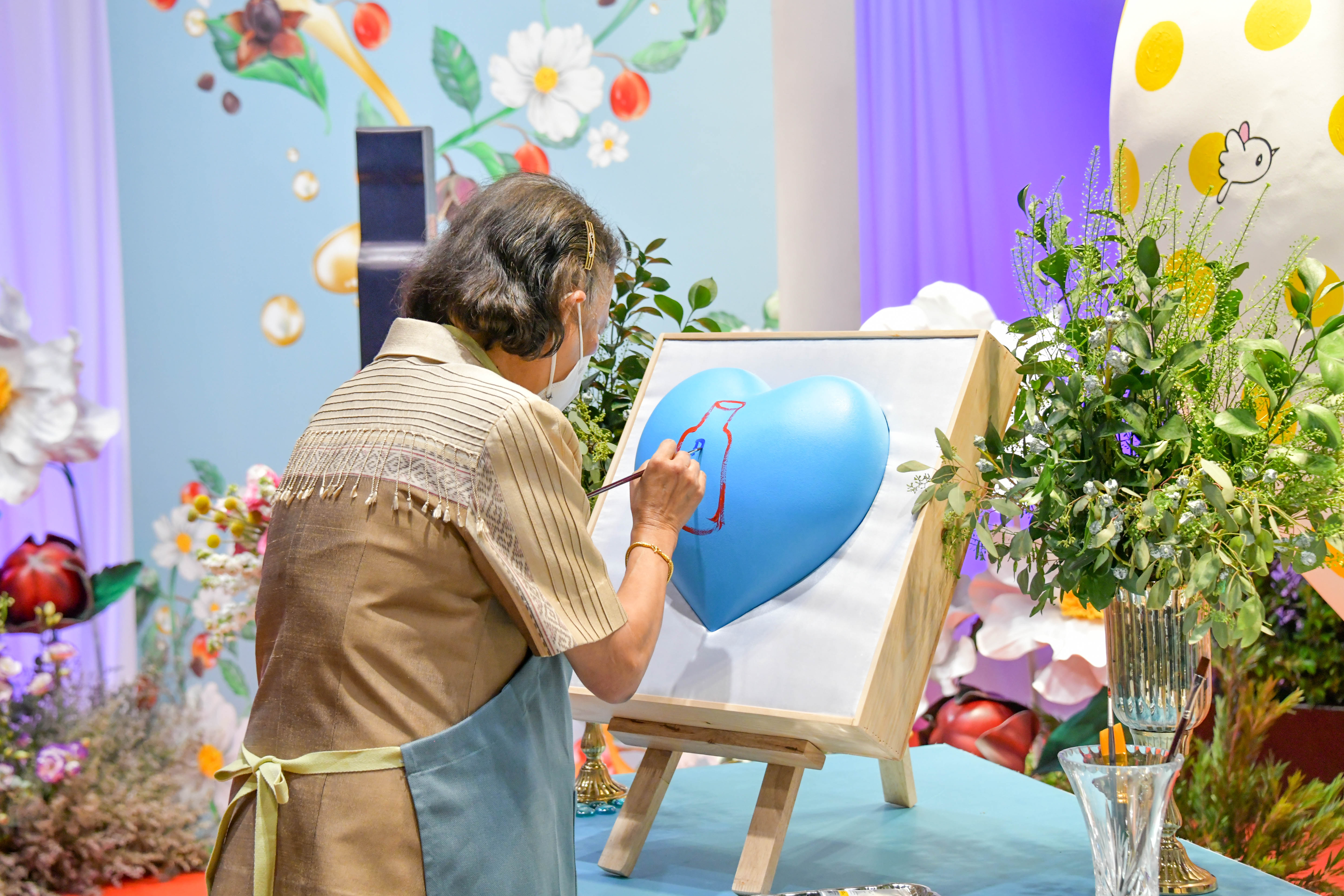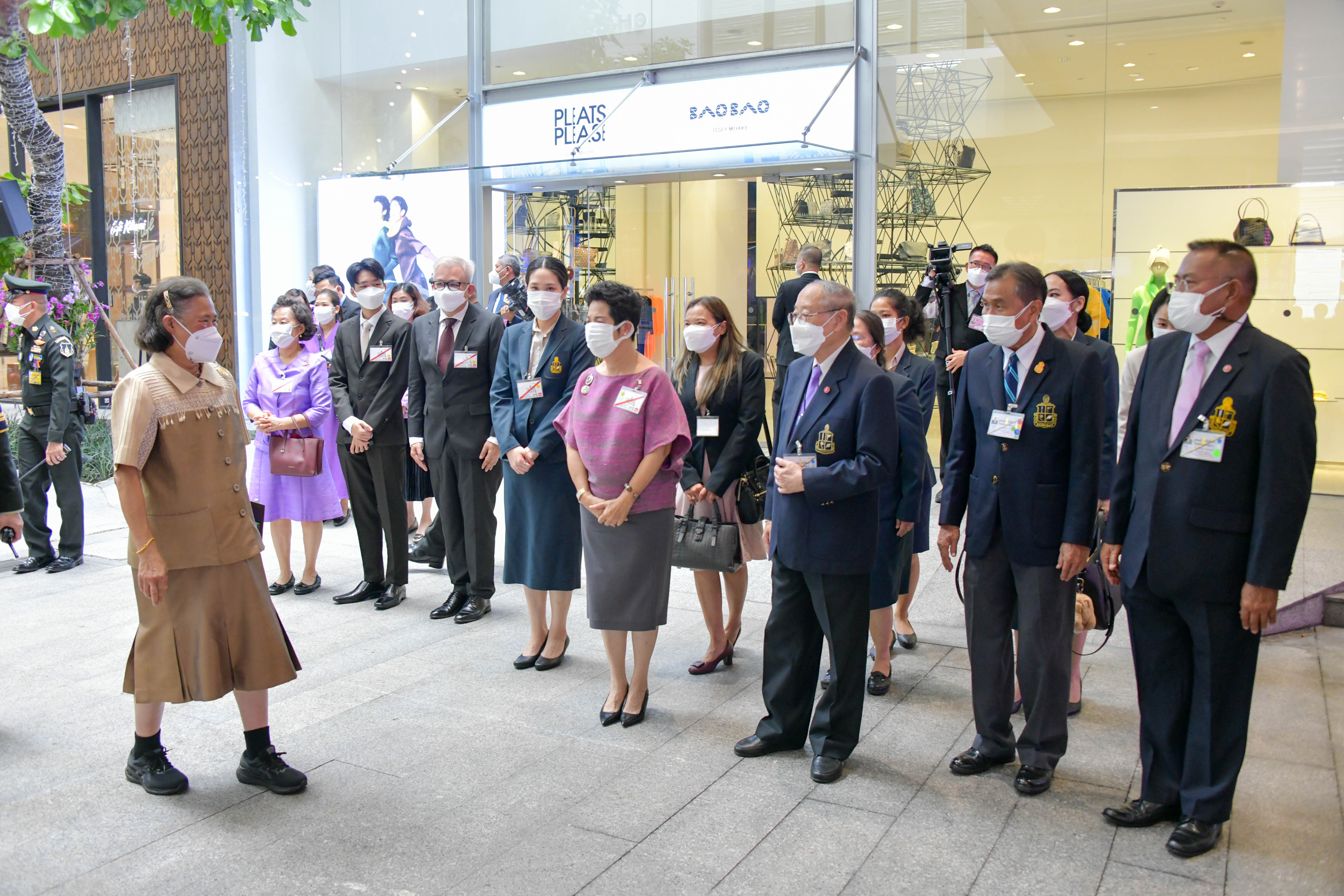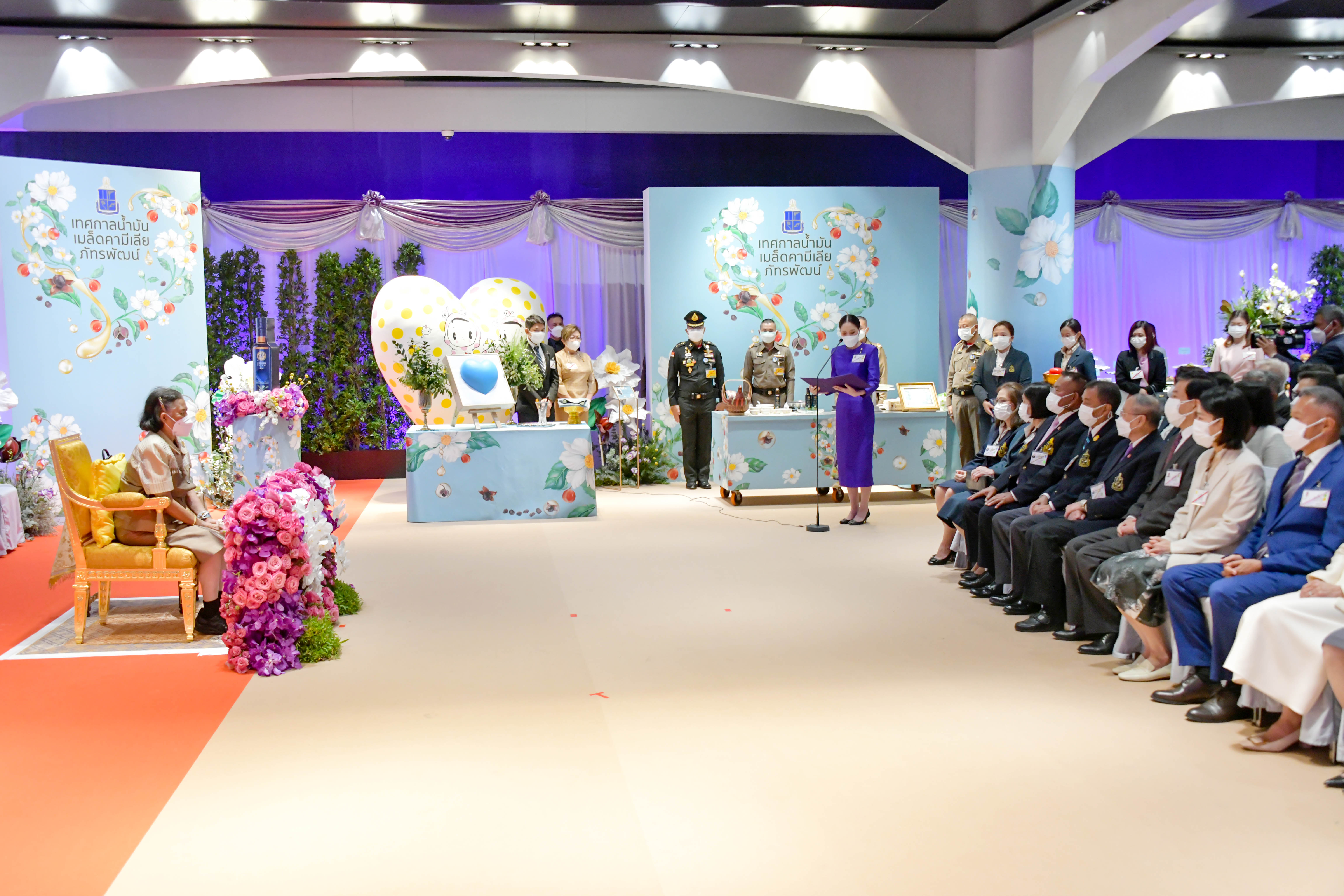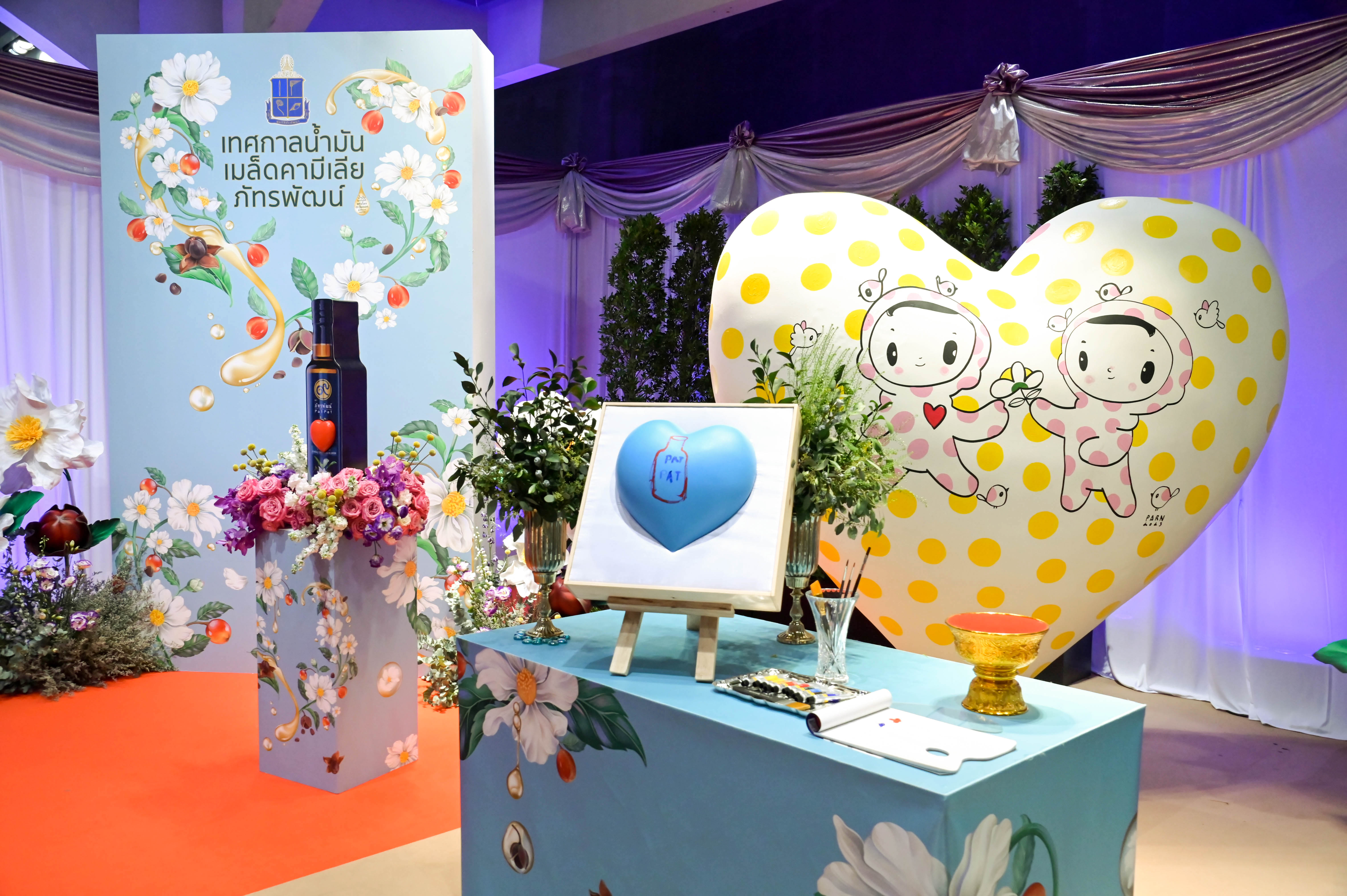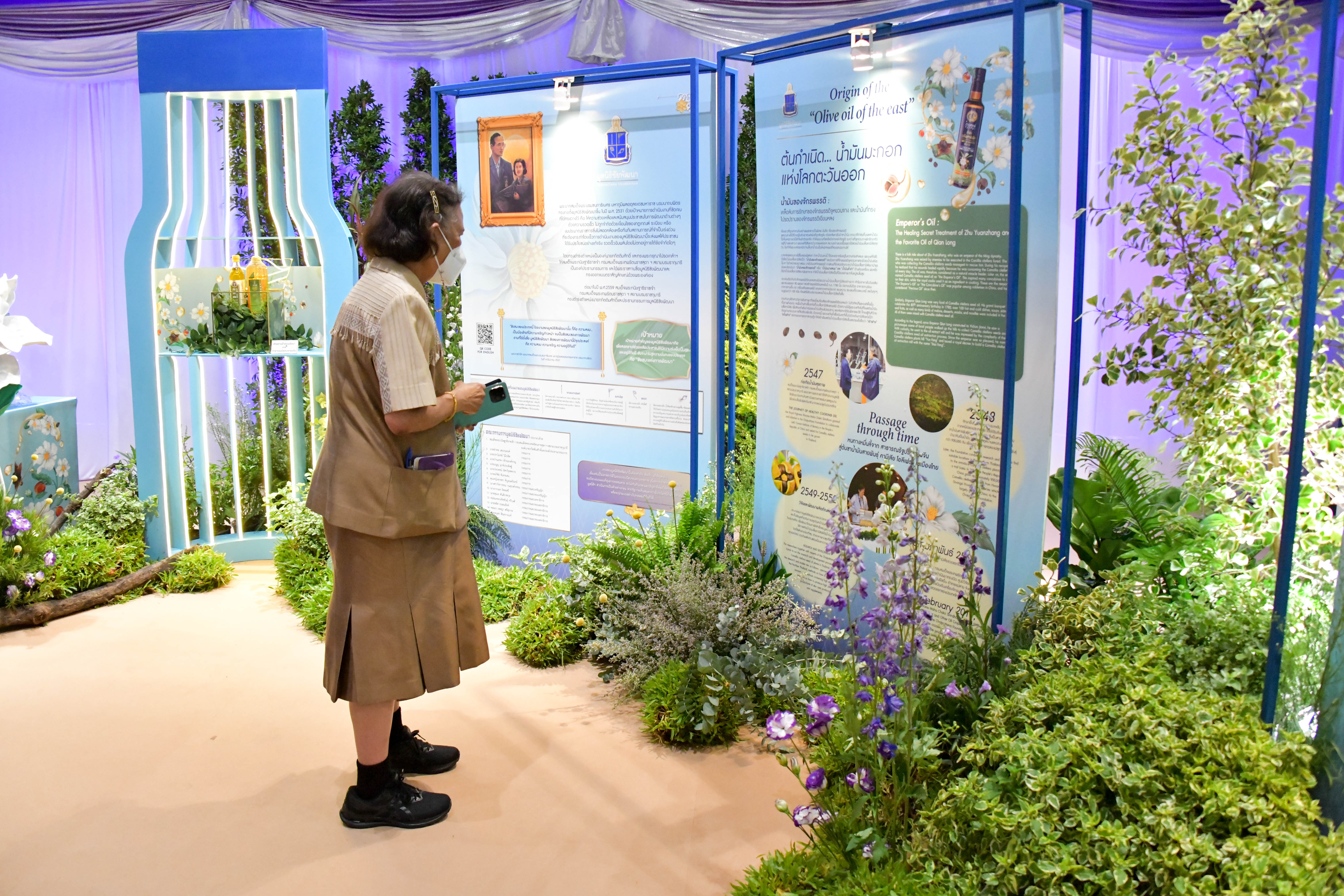 จากนั้น ทอดพระเนตรนิทรรศการบอกเล่าเรื่องราวน้ำมันเมล็ดคามีเลีย และการจัดแสดงผ้าไหมย้อมสีธรรมชาติจากเปลือกของผลชาน้ำมัน สายพันธุ์คามีเลีย โอลีเฟร่า โดยกลุ่มทอผ้าไหมจากศูนย์เรียนรู้หม่อนไหมของมูลนิธิชัยพัฒนา ณ บ้านโนนเสาเล้า อำเภอบ้านเขว้า จังหวัดชัยภูมิ รวมถึงงานศิลปะ Heart Installation จากศิลปินรับเชิญภายใต้คอนเซ็ปต์ “Born from Heart, Made for Health”